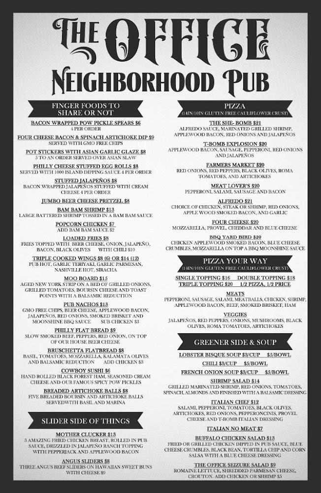 The menu at The Office Neighborhood Pub is extensive and varied. Expect options from sliders and tacos to hearty salads and pizzas. Standout dishes include the Mother Cluckers and Cajun pasta. Pricing is reasonable, averaging around $15. Families appreciate the kid-friendly options available. The menu caters to vegetarians, ensuring everyone finds something to enjoy. Nighttime offerings and bar bites keep the vibe lively into the evening.